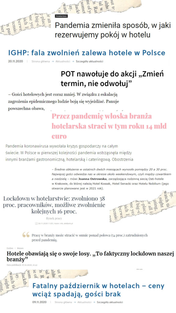 Dziś nagłówki portali takich jak: hotelarz.pl horecabc.pl, rp.pl, horecatrends.pl, czy PTG (polskie towarzystwo geograficzne), IGHP (polska izba hotelarska) nie napawają optymizmem. Wirus zbiera swoje śmiertelne żniwo zarówno w turystyce jak i innych sektorach gospodarki.