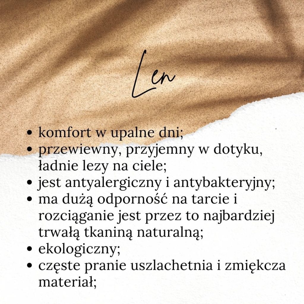 Kolejnym wartym uwagi materiałem jest len. Len jest materiałem naturalnym. Len jest jedną z najstarszych tkanin, jej historia sięga 7500 p.n.e. Tkanina lniana swój początek miała w starożytnym Egipcie i była w formie bardzo przejrzystego i delikatnego materiału. Dziś to dość drogi i najbardziej ekologiczny materiał na świecie. Jego produkcja jest przyjazna dla środowiska i całkowicie biodegradowalna.
