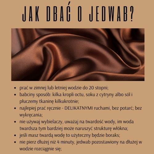 Zaraz po zwierzęcym i ciepłym włóknie jakim jest wełna na nasz szacunek zasługuje jedwab. O tym królewskim materiale dowiesz się nieco więcej tutaj. Jedwab tak samo jak wełna nie lubi wysokich temperatur prania, pocierania oraz wyciskania. Najlepiej jest go prać w naturalnych składnikach takich jak: sok z cytryny, kilka kropli octu, albo szczypta soli (to takie „babcine ale skuteczne sposoby). Unikać należy wybielaczy czy płynów do płukania. Włókno jedwabiu może także naruszyć się przy twardej wodzie, jeśli taką masz użyteczny będzie boraks. (naturalny środek czyszczący i zmiękczający).