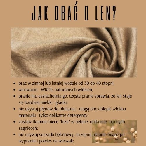 Na nieco więcej szaleństwa możemy pozwolić sobie z dbaniem o len. Len to najbardziej ekologiczny materiał na świecie, a pranie dodaje mu jeszcze więcej uroku. Częste namaczanie lnu w odpowiednich temperaturach sprawia, że materiał jest bardziej miękki i gładki. Temperatura wody to 30-40 stopni, lecz bez wirowania – może powodować zagniecenia, które bardzo ciężko będzie wyprasować oraz bez płynów do płukania – mogą oblepić włókno tkaniny. Najlepiej jest zaraz po wypraniu strzepnąć materiał by wrócił do odpowiedniej formy i rozwiesić na wieszaku pozostawiając trochę „luzu” wokół.