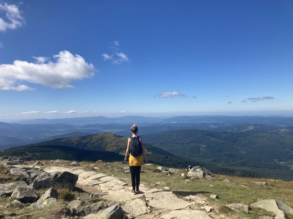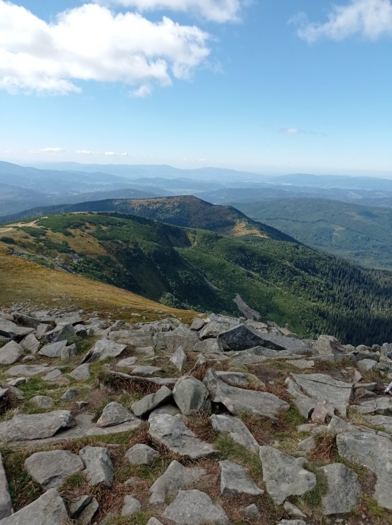 Jako, że to mój pierwszy zdobyty pieszo szczyt w Polsce, nie miałam zupełnie pojęcia co mnie czeka, tak jak wtedy, gdy pierwszy raz wsiadałam do samolotu, czułam podekscytowanie, ciekawość i chęć przygody. Niestety dość szybko, bo już po około 10 minutach od wejścia na szlak zdałam sobie sprawę, że łatwo nie będzie, jeśli ma być pięknie. Szlak czerwony okazał się, tak jak i sama góra złożony z kamieni, przy którym dobre buty to podstawa. Stąpać po kamieniach, gdzie w każdej chwili stopa może się poślizgnąć, wykrzywić itp., to nie lada wyzwanie dla obuwia. Wejście na szczyt okazało się jednak dużo prostsze niż zejście. Dla mnie osobiście zejście było dużo bardziej wymagające, zwłaszcza dla moich kolan, ciągłe schodzenie po kamiennych schodach w dół przyprawiało mnie czasem o złość biorącą się oczywiście ze zmęczenia, walczyłam ze sobą, ze swoją głową, słabościami, emocjami, by na koniec sobie podziękować za wytrwałość. Ta podróż była kształtująca dla mojego charakteru jak i sylwetki i wiecie co? Chcę już zdobyć kolejny szczyt!
